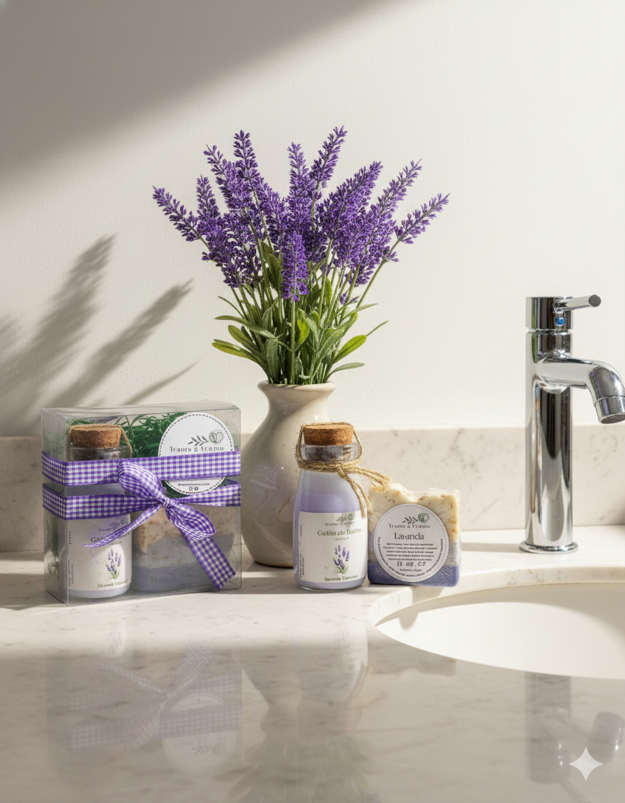 O Kit Vegano Lavanda combina um Sabonete em Barra 90g e uma Geleia de Banho Vegana 100ml, criando um ritual de autocuidado suave e consciente com o aroma clássico e elegante da lavanda.