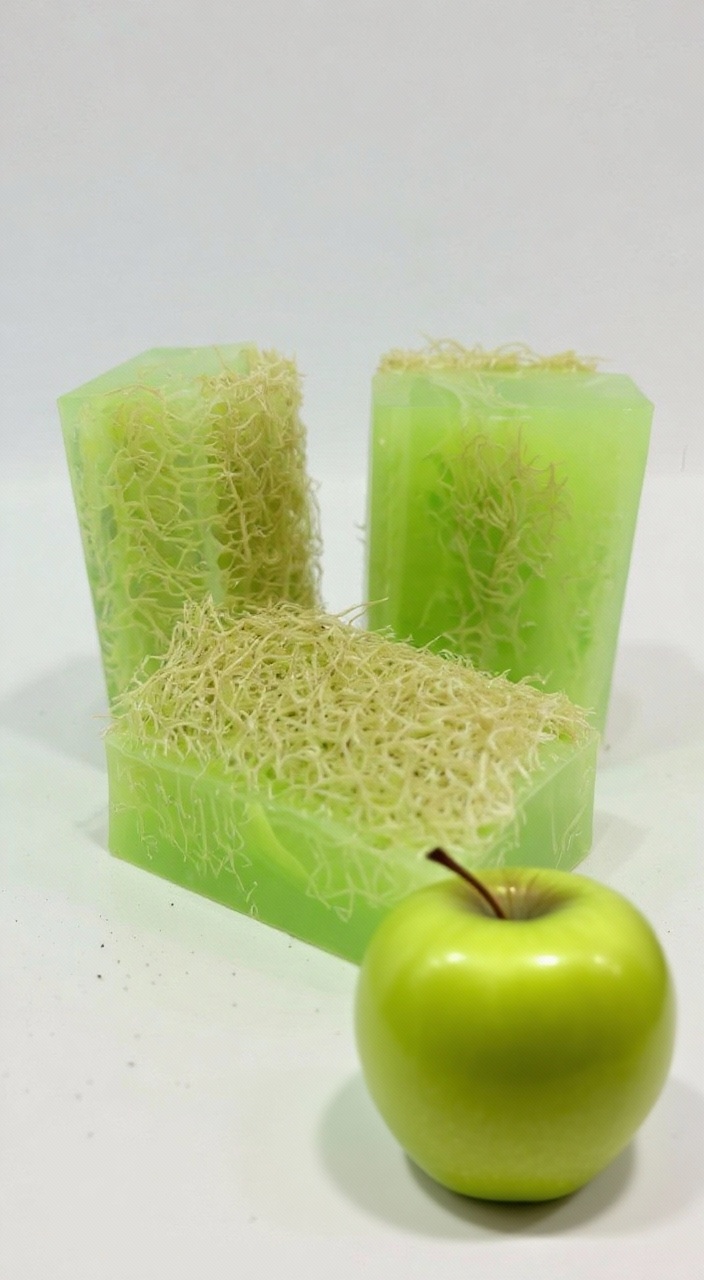 Sabonete Artesanal com Bucha Vegetal Quadrado Maçã Verde 150g – Esfoliação Natural e Aroma Refrescante