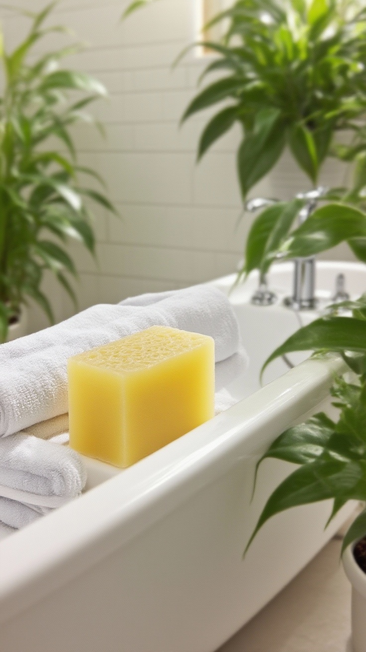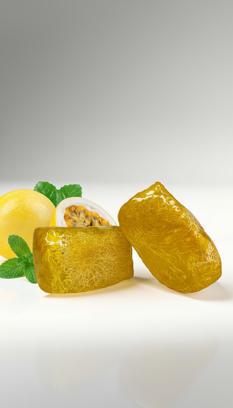 Nosso Sabonete Quadrado de Mouse de Maracujá com Bucha Vegetal 200g limpa, esfolia e perfuma a pele com frescor leve e acolhedor.