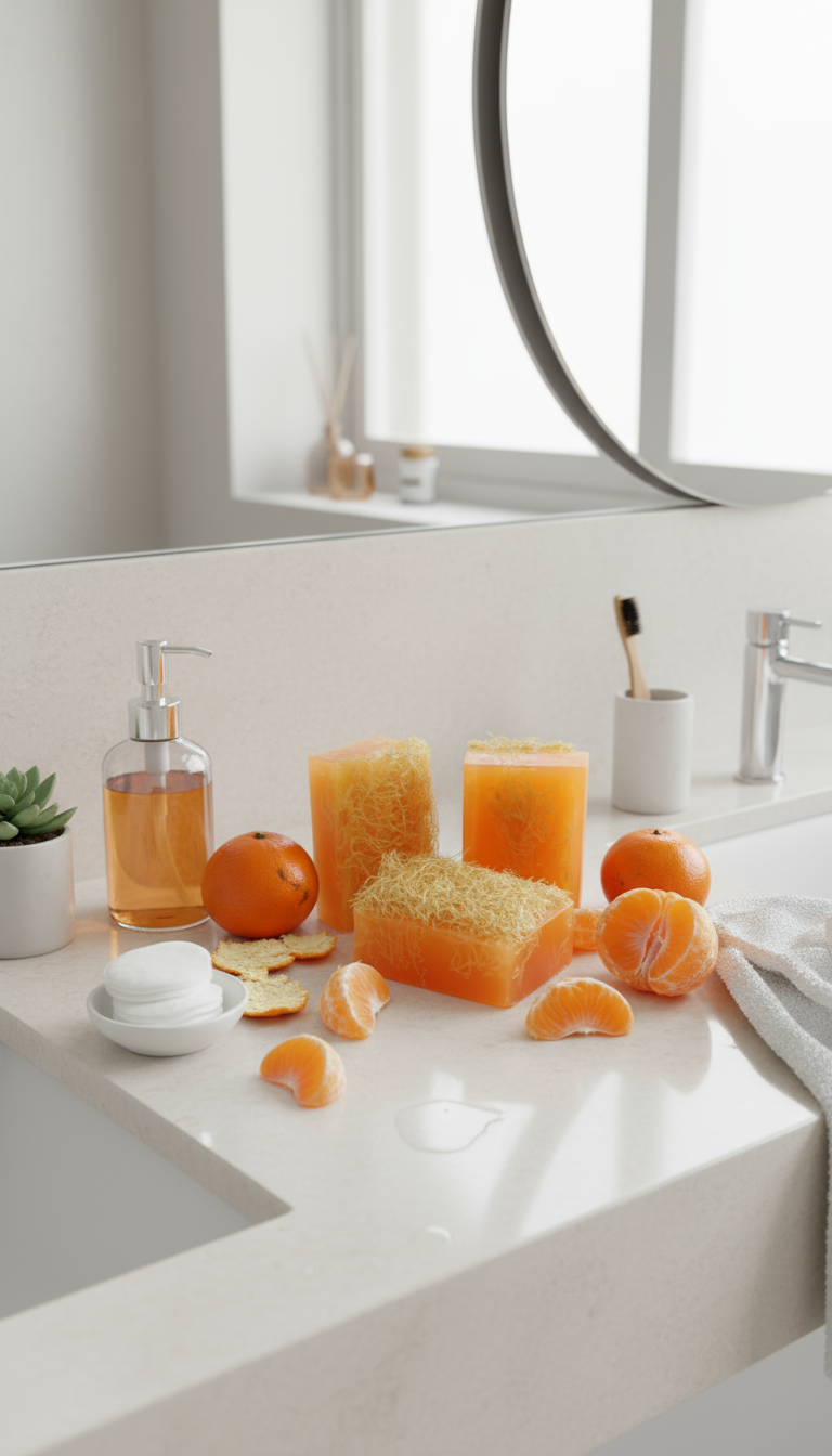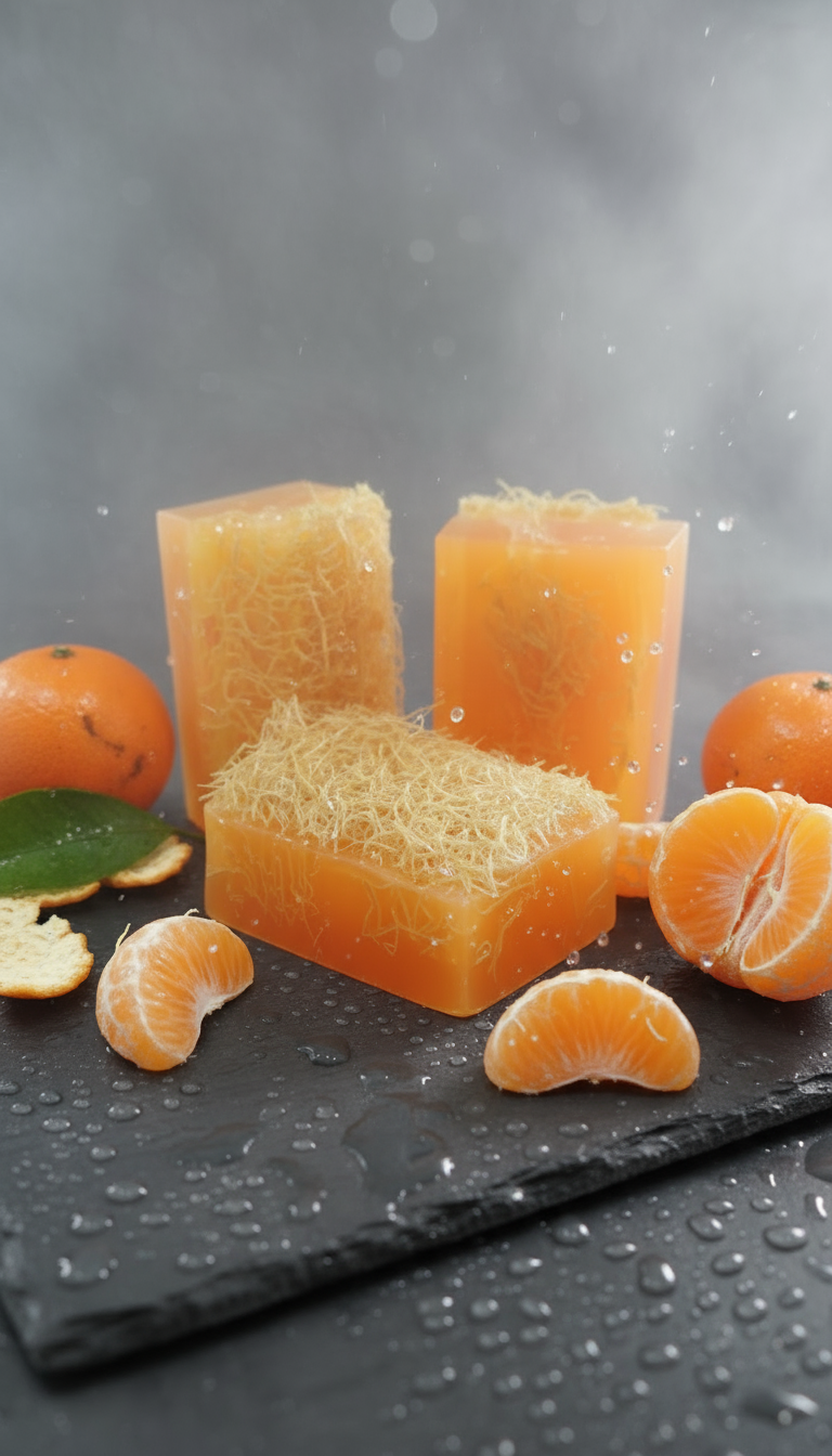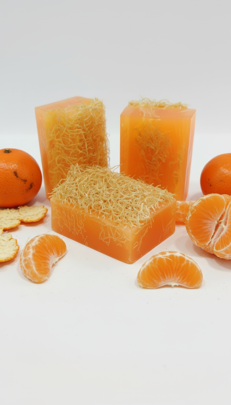 Sabonete Artesanal com Bucha Vegetal Tangerina e Sândalo 150g – Esfoliação Natural e Hidratação Profunda